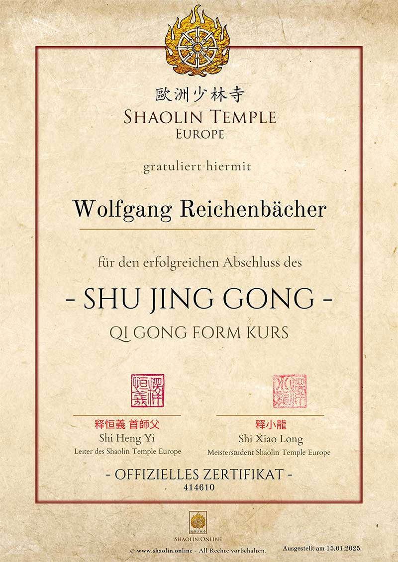Shu Jing Gong ist eine schöne und etwas anspruchsvollere Qigong-Form von Shi Heng Yi aus dem Shaolin Tempel Europa. Ich freue mich über das Zertifikat und eine weitere Qigong-Form erlernt zu haben die ich nun praktizieren kann.